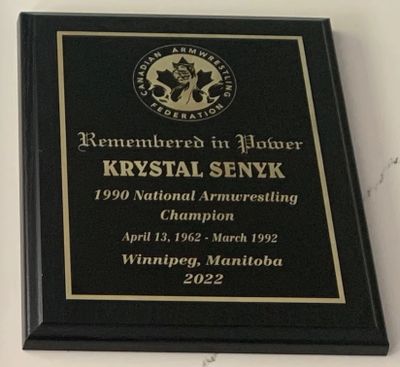 In honor of Krystal’s memory, the E.A.C presented a plaque to her family at the 2022 Canadian National Championships, honoring their plight for justice, her Arm wrestling achievements, and her legacy of helping others. On behalf of the Senyk family, they wish to thank you all for remembering Krystal and the sacrifice she made to keep a friend and her children safe. She was indeed selfless.